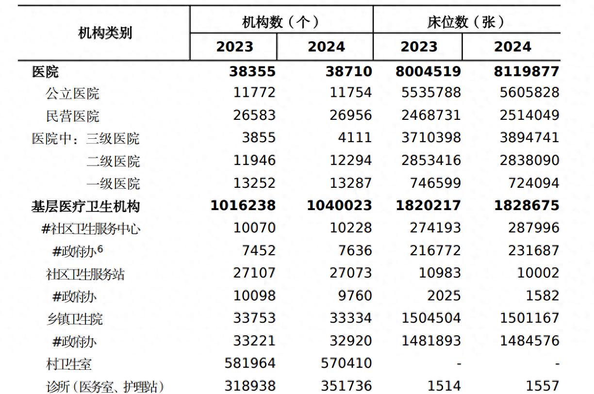 截至2024年年末,全国医院数量有38710家。其中,公立医院有11754家,民营医院有26956家。民营医院数量约为公立医院数量的2.3倍。2025年12月2日,国家卫生健康委发布的《2024年我国卫生健康事业发展统计公报》披露了上述数据。