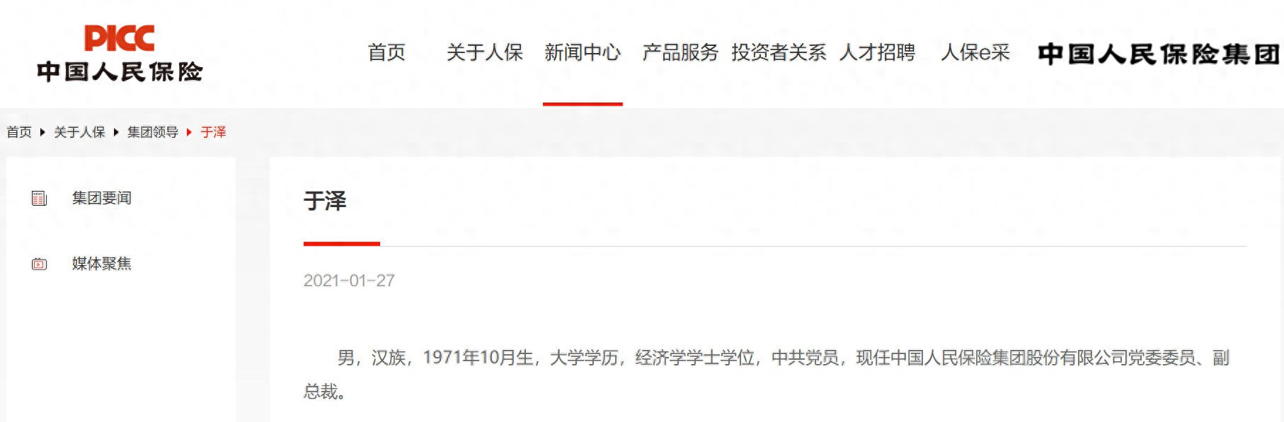 中国人民保险集团股份有限公司官网公布的简历显示,于泽,男,汉族,1971年10月生,大学学历,经济学学士学位,中共党员,现任中国人民保险集团股份有限公司党委委员、副总裁。