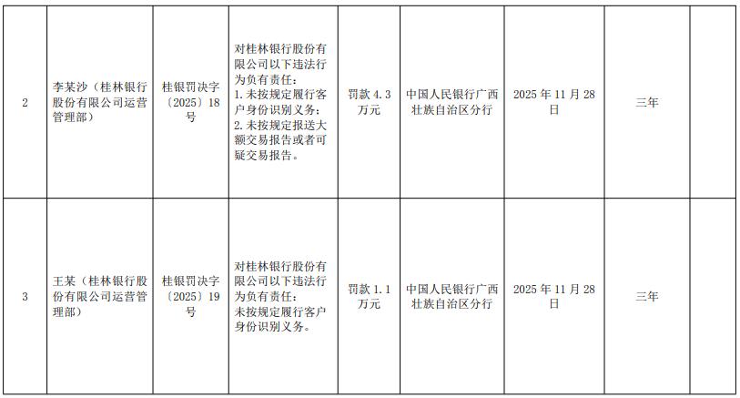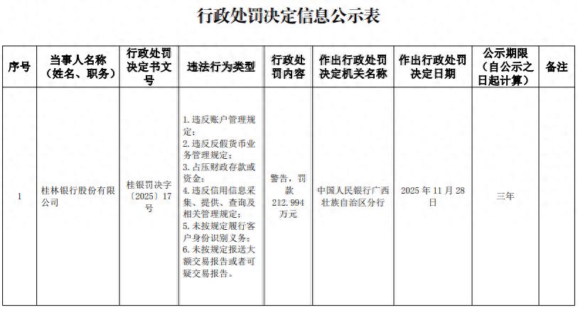 近日,中国人民银行广西壮族自治区分行发布的行政处罚决定信息显示,桂林银行因六项违规行为被警告并罚款212.994万元。同时,该行运营管理部两名员工对相关违规行为负有责任,分别被处以4.3万元和1.1万元罚款。