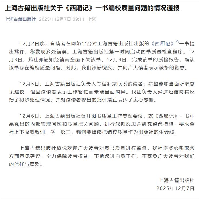 12月7日,上海古籍出版社就《西厢记》一书编校质量问题,发布情况通报。全文如下: