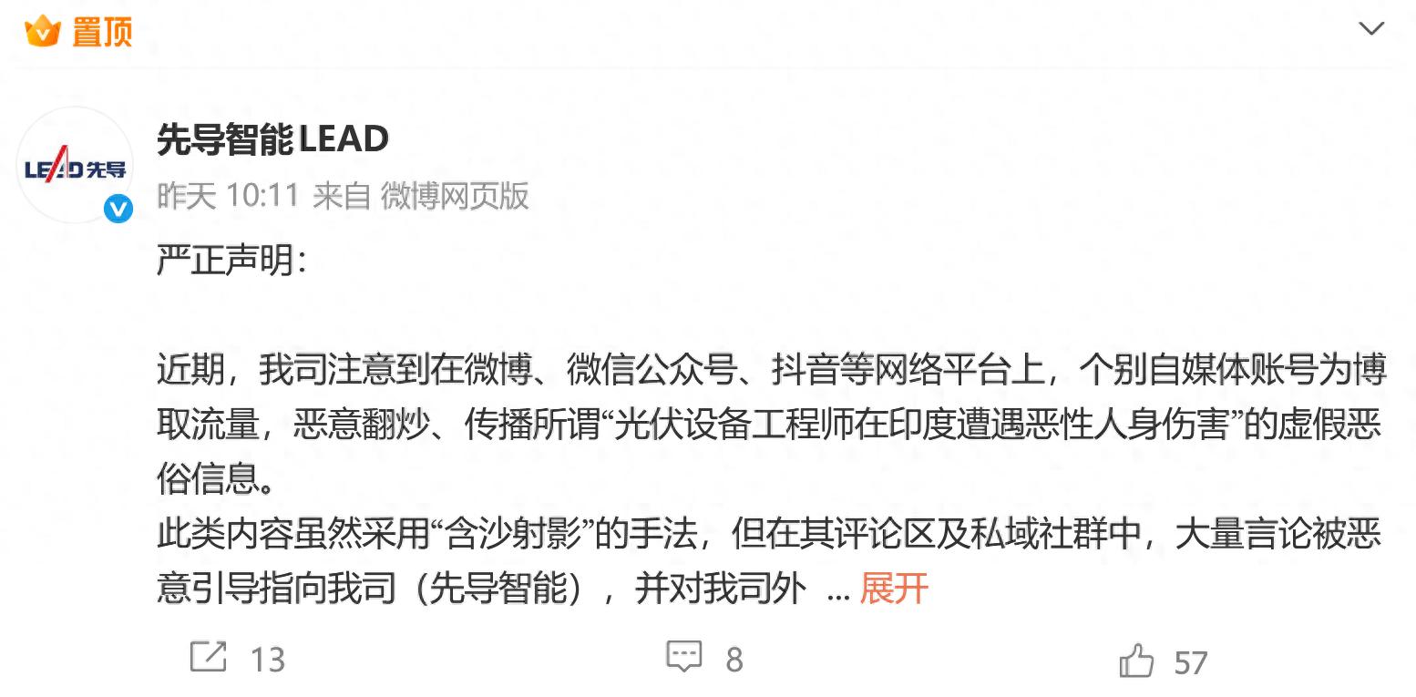近期,我司注意到在微博、微信公众号、抖音等网络平台上,个别自媒体账号为博取流量,恶意翻炒、传播所谓“光伏设备工程师在印度遭遇恶性人身伤害”的虚假恶俗信息。