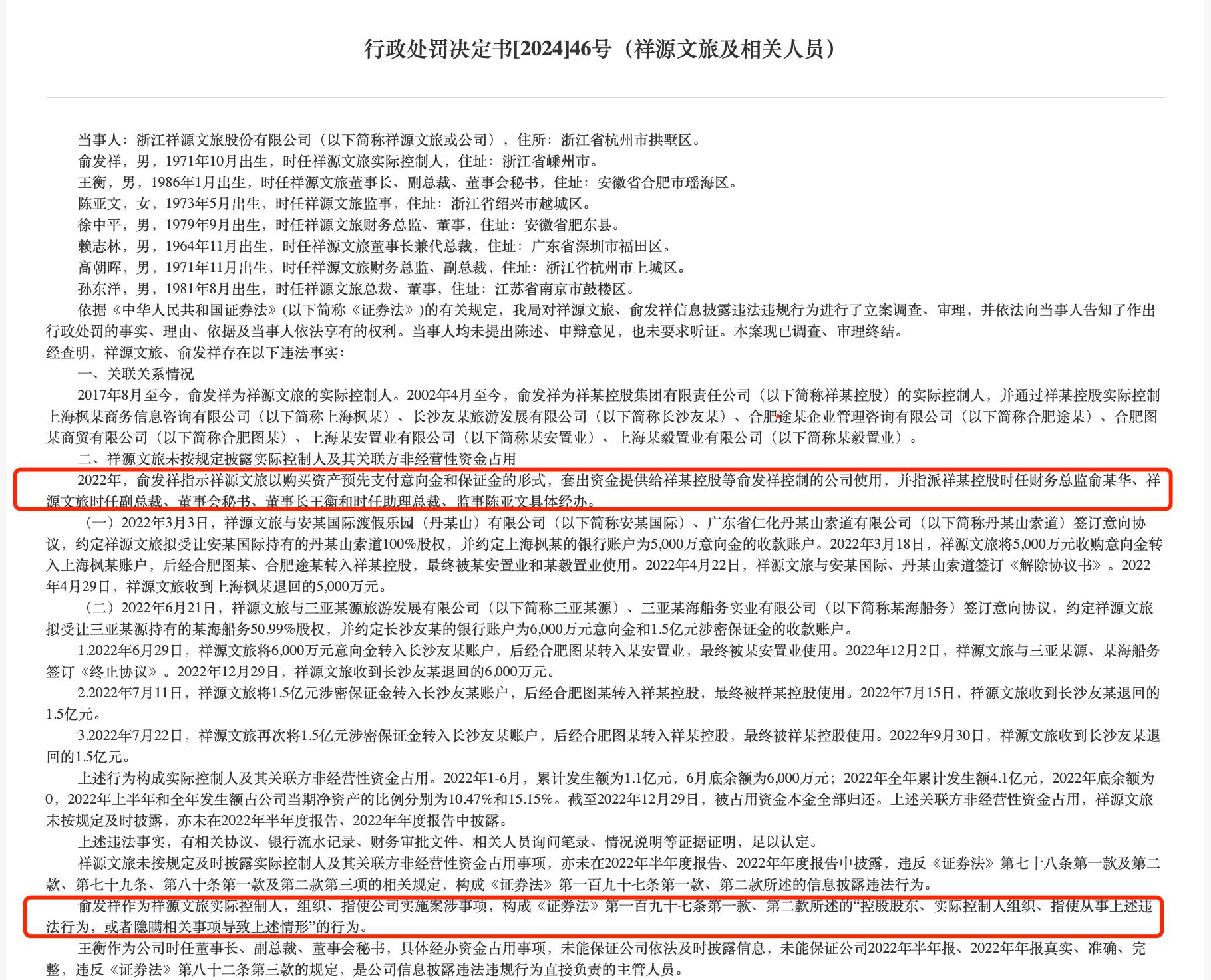 “祥源系”的治理问题在去年就已显露。2024年12月17日,浙江证监局发布《行政处罚决定书〔2024〕46号》,对祥源文旅及相关人员做出行政处罚,揭露了公司实际控制人俞发祥及关联方非经营性资金占用的事实。