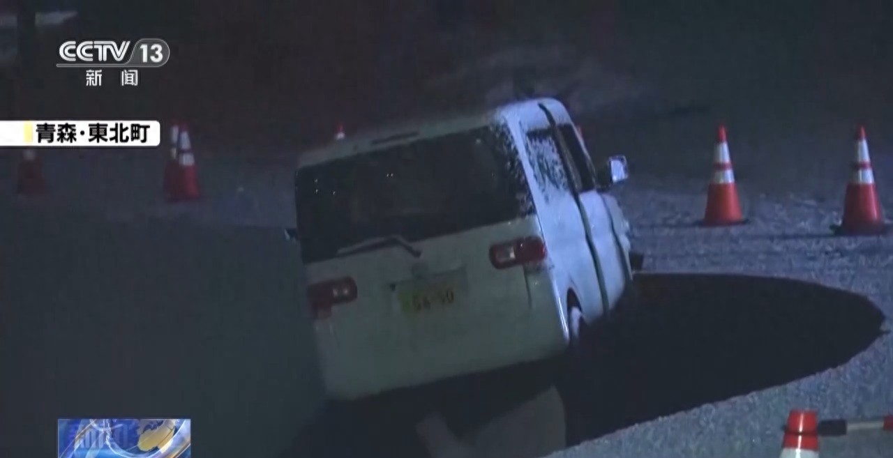 在青森县,当地部分建筑和道路受到地震影响:有建筑因地震受损,坠落碎片砸中停在周边的汽车,大量建筑碎片散落在道路上。此外,当地有道路因地震坍塌,车辆被困在受损道路当中,交通被迫中断。