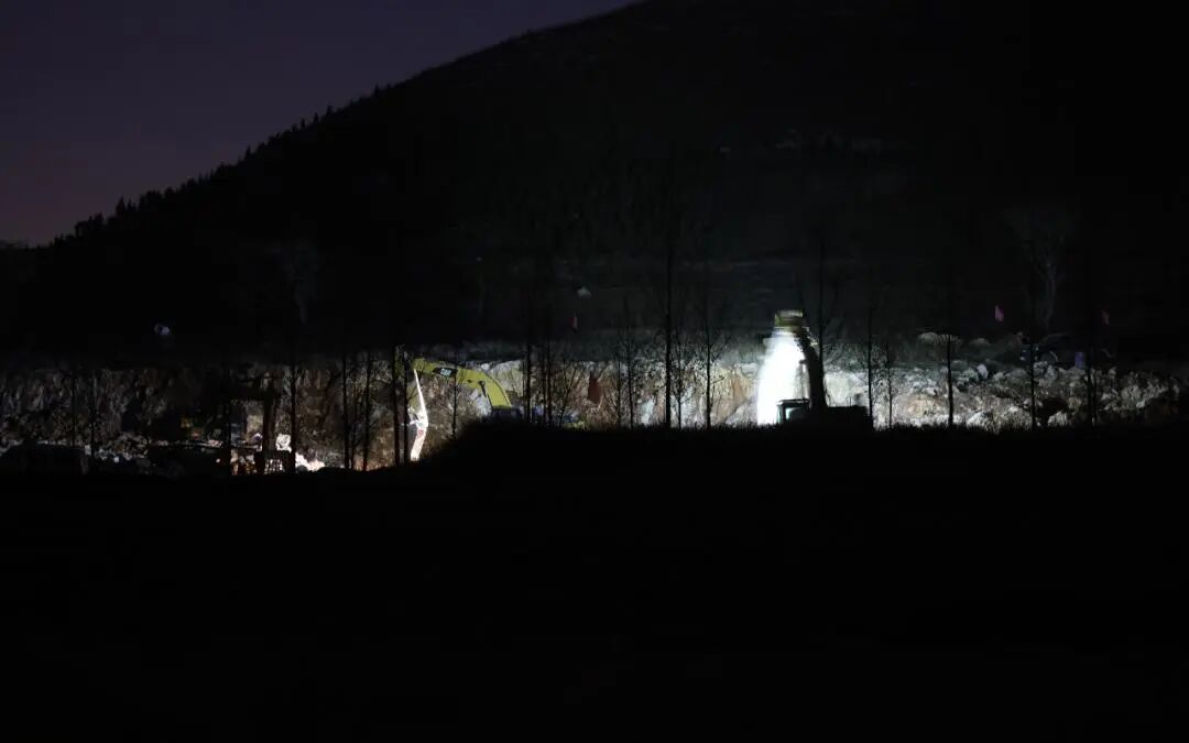 11月28日晚8时,圣泉生态公司养殖场内两台铲车正在开采矿石。 新京报记者 李英强 摄