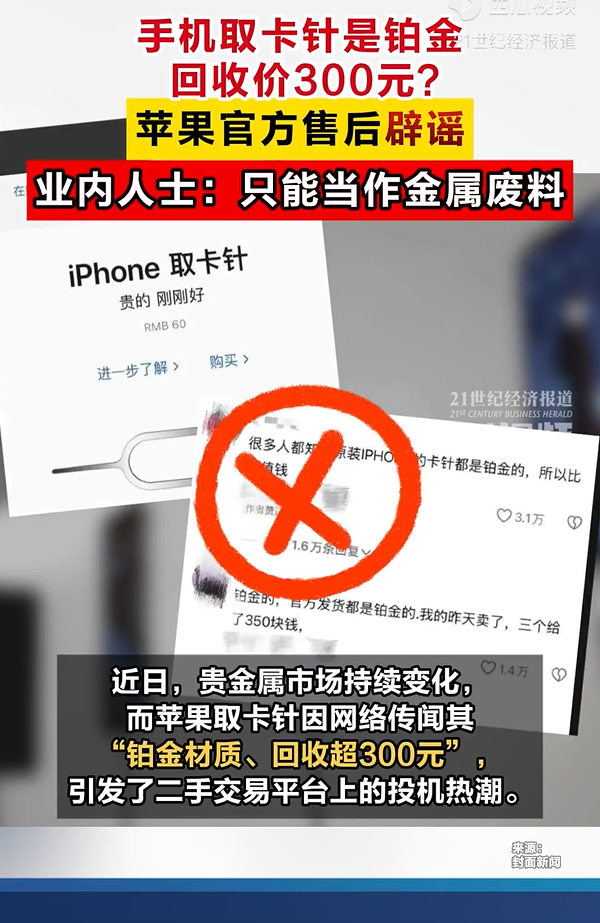 尽管苹果官方已经澄清,但二手市场上的“铂金卡针”交易并未立即降温。一位在二手平台销售“铂金卡针”的卖家称:“我知道这不是真铂金,但网上都这么说,而且真有人信、真有人买。这就是市场。”