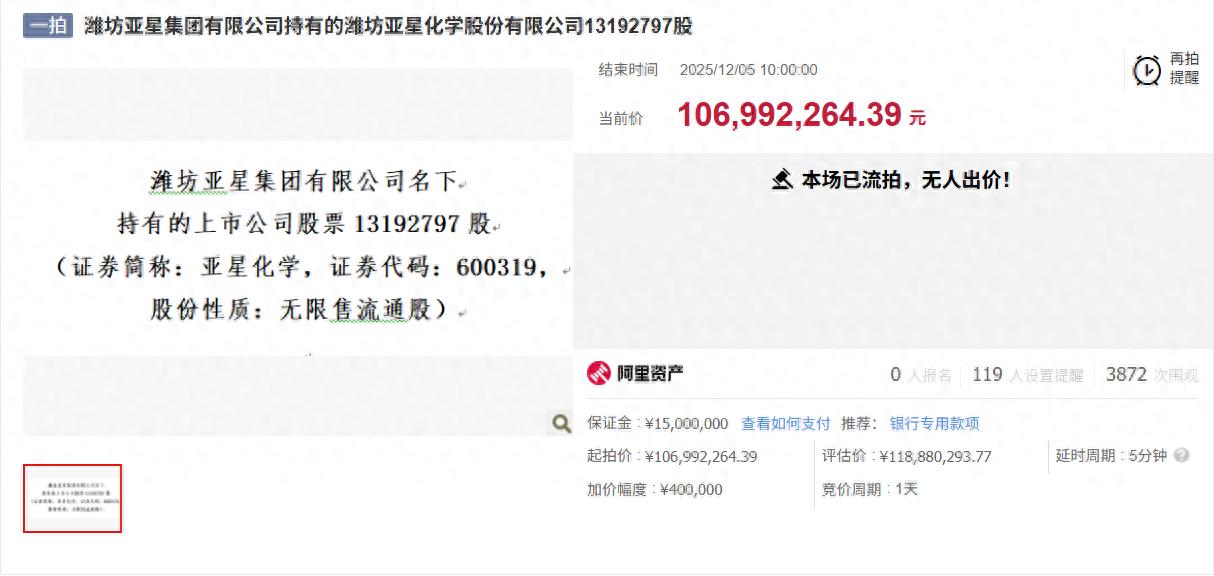 12月8日,阿里巴巴司法拍卖网络平台信息显示,上述亚星集团持有的1319.2797万股股票将于12月24日10时至12月25日10时进行第二次司法拍卖。截至发稿,二拍仍显示0人报名。