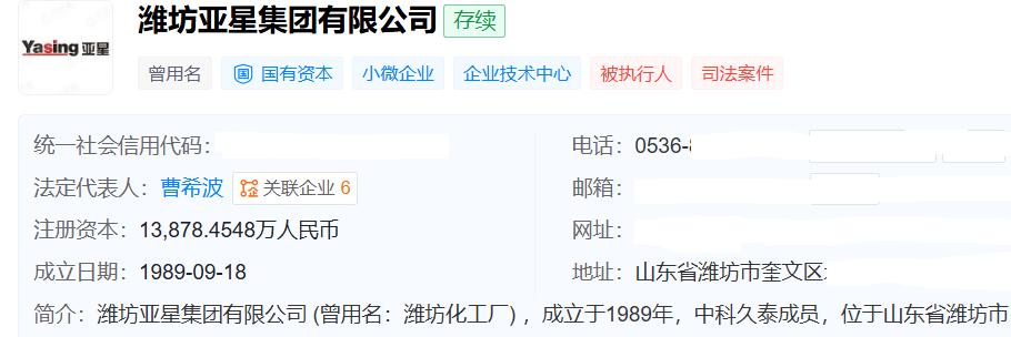天眼查显示,亚星集团成立于1989年9月,注册资本约为1.39亿元,法定代表人是曹希波。
