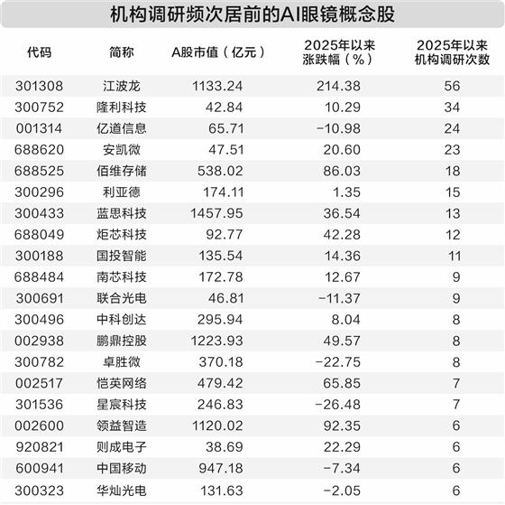 从机构关注情况来看,截至12月9日,今年以来机构调研10次以上的AI眼镜概念股有9只,如江波龙、隆利科技、亿道信息、安凯微、佰维存储等。江波龙年内累计获调研56次,高居榜首。