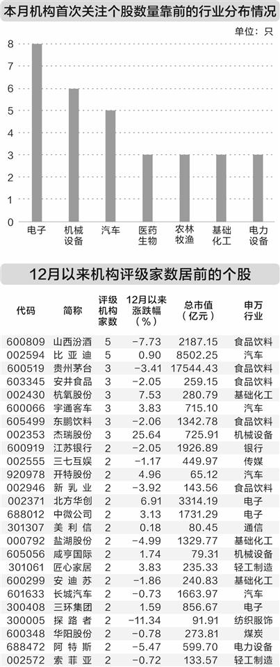 机构首次关注的个股中,电子行业股数量最多,达到8只,占总数的17.78%,成为最受青睐的领域;机械设备、汽车紧随其后,分别为6只、5只,凸显出近年来战略性新兴产业正持续获得机构投资者的重点关注。