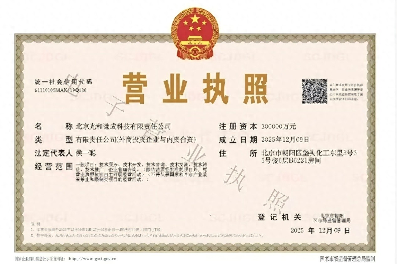 根据网传的相关营业执照信息,北京光和谦成科技有限责任公司登记成立于2025年12月9日,注册资本为30亿元,法定代表人为侯一聪,登记机关为北京市朝阳区市场监督管理局,经营范围包括技术服务、技术开发、技术咨询、技术交流、技术转让和技术推广等。