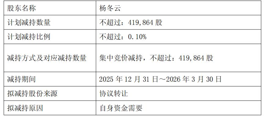 截至2025年12月8日,杨冬云共持有2152.7361万股香飘飘股票,占公司总股本的5.21%,此次拟减持不超过41.9864万股,减持时间是2025年12月31日-2026年3月30日,这也是其首次减持股票。