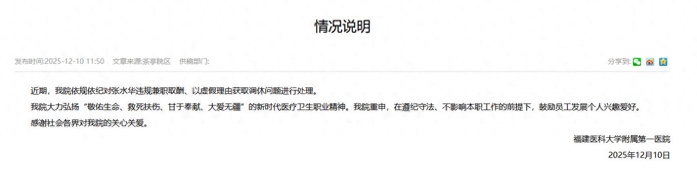 12月10日,福州医科大学附属第一医院通过官方网站发布情况说明,全文如下: