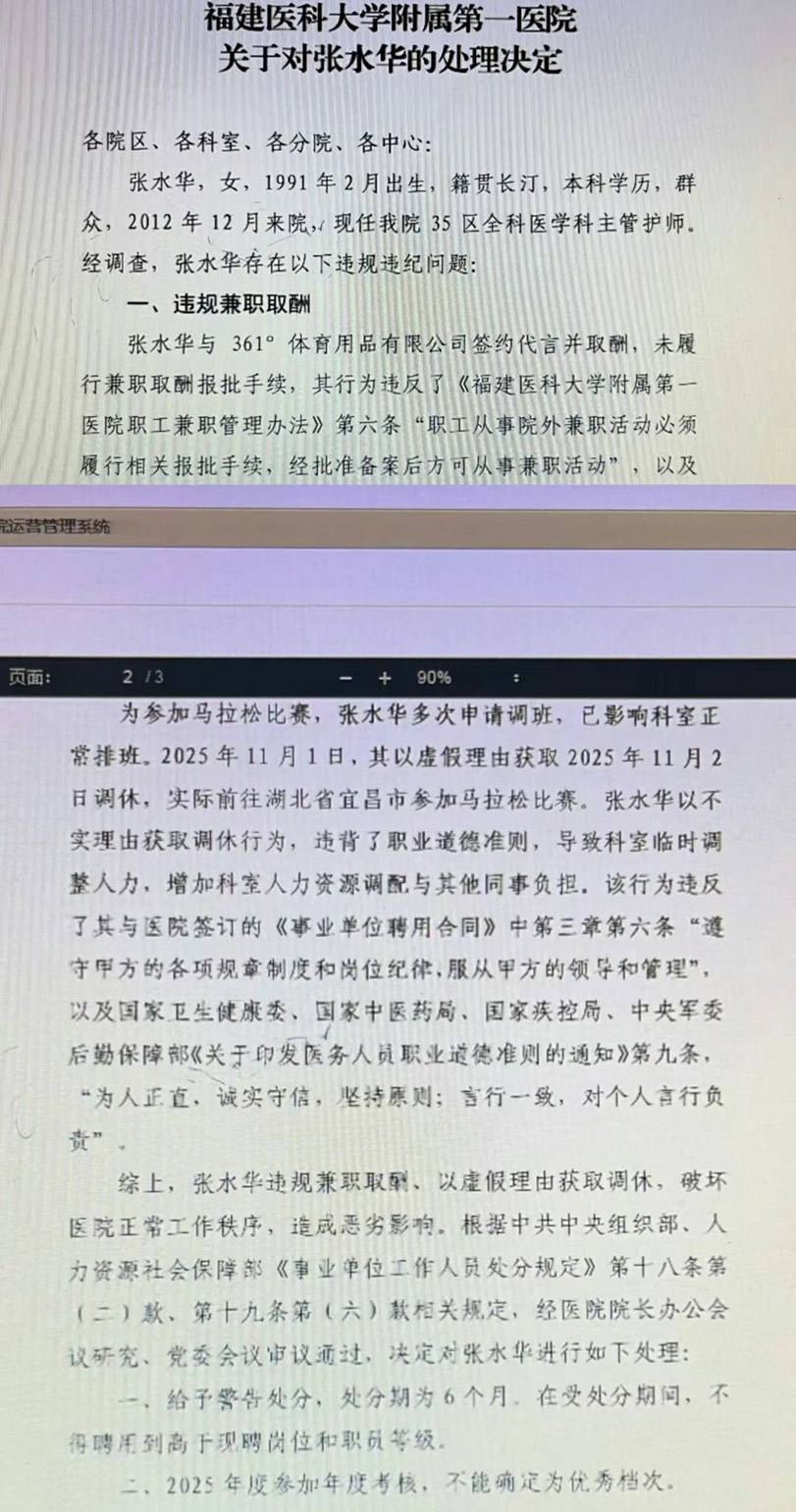 此外,文件还指出,张水华为参加马拉松,多次申请调班,已影响科室正常排班。11月1日,她以虚假理由获得11月2日的调休,实际是去了湖北宜昌参加马拉松比赛。医院称其没有依据实际理由获取调休的行为,违背了职业道德准则,导致科室临时调整人力,增加了科室人力资源调配与其她同事的负担。该行为违反了《事业单位聘用合同》的相关条款。