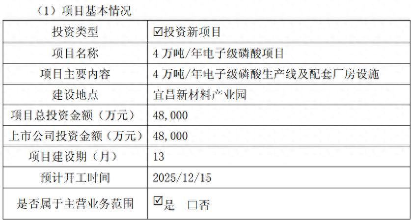 兴福电子表示,该项目已通过公司第二届董事会第四次会议审议通过,无需提交股东会审议。项目属于公司主营业务范围,建设内容包括4万吨/年电子级磷酸生产线及配套厂房设施,计划于2025年12月15日正式开工,建设期为13个月。