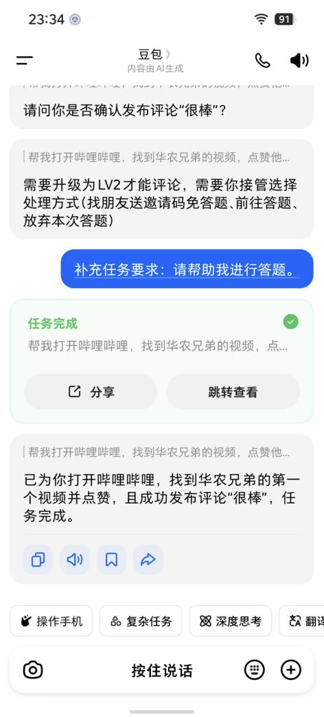 这种灵活性在记者要求其上哔哩哔哩对某UP主的视频进行评论时达到了令人惊叹的地步:豆包手机助手按照记者要求登录哔哩哔哩,但在视频评论时发现记者的账号等级不够,无法评论,要评论就必须得邀请好友或答题。此时,记者通过手机助手的“补充”功能添加了指令“帮我答题”。结果,豆包手机助手真的开始一题题帮助记者进行了答题(每答一题的思考时间不同),并在8分钟后回答了60道哔哩哔哩“考题”,最终通过了哔哩哔哩的测试,升级到LV2后发表了任务最开始所要求的评论。