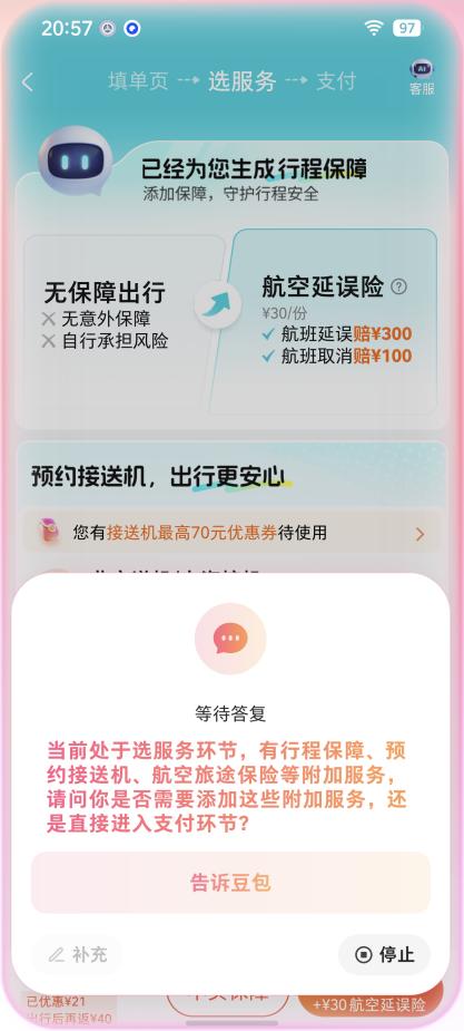 另外,在面对一些App的引诱式选项时,它也能清楚分辨,例如记者经常使用某OTA平台购买飞机票,此类平台在购买机票步骤的末尾通常会通过选项颜色加深等方式“引导”用户购买保险等附加服务,而当记者本次测试时,豆包手机助手就在这一步进行了提示,“清楚明了”地咨询记者“是否要添加附加服务”。
