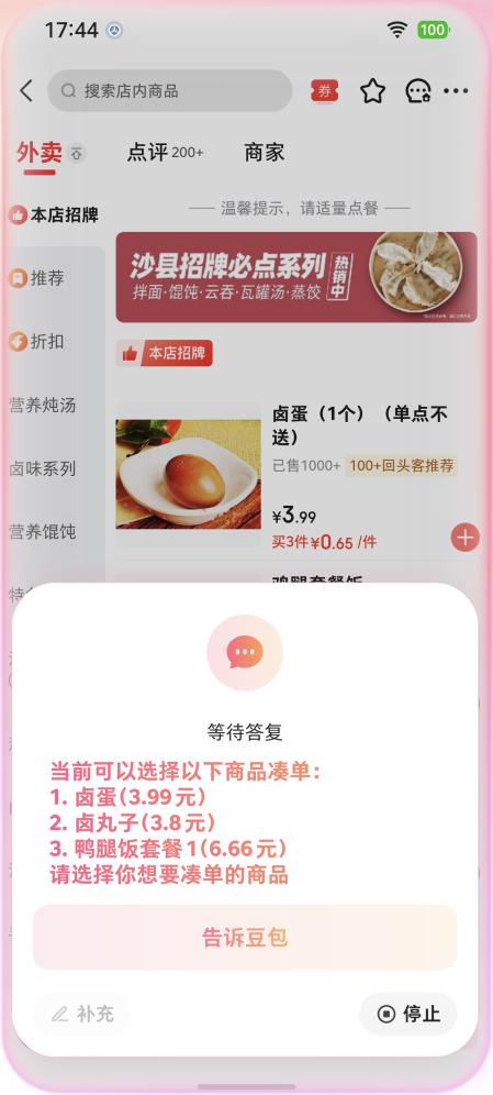 例如,记者此前曾通过豆包手机助手在便签中输入了“我想吃猪脚饭”。而之后,记者通过豆包手机助手下达指令“帮我订一份晚饭,点什么你看着办,便宜点,离我近的都行”这样的模糊指令之后,豆包手机助手的执行逻辑显示为“搜索猪脚饭,筛选便宜近的”。而在京东外卖的页面,当遭遇起送价不够,需要凑单的情况时,面对记者下达的“你看着凑”的指令,选择了卤蛋和卤丸子作为推荐的凑单商品,而类似的选项还有卤豆干、紫菜蛋花汤、烤肠、荷包蛋等,这一“选择”正属于豆包手机助手的“主观”推荐。