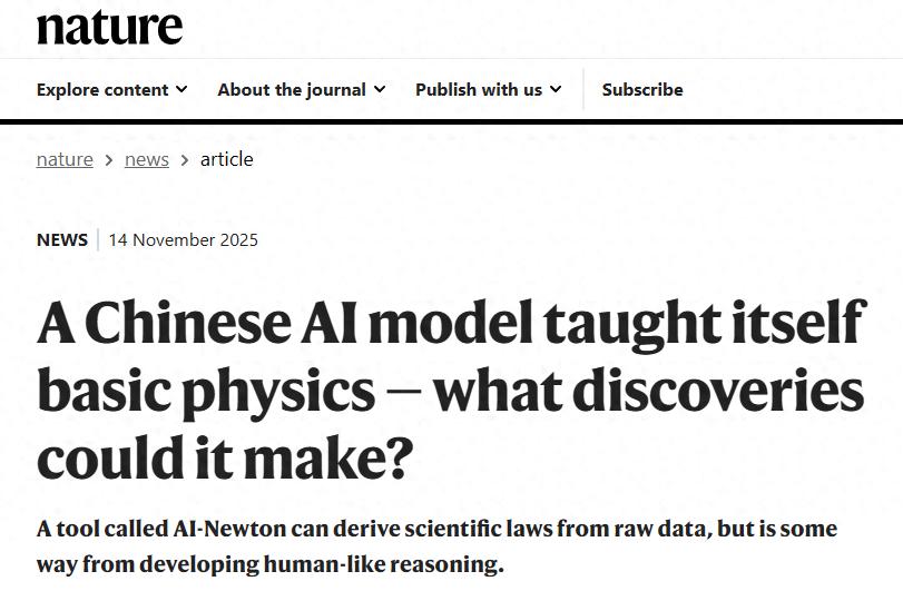 2025 年 11 月 14 日,《自然》(Nature)新闻栏目以《一个中国人工智能模型自主学到了基础物理学 —— 它能发现什么》(“A Chinese AI model taught itself basic physics — what discoveries could it make?”)为题,长篇专题报道了北京大学物理学院马滟青教授课题组在人工智能驱动科学发现领域取得的新进展。