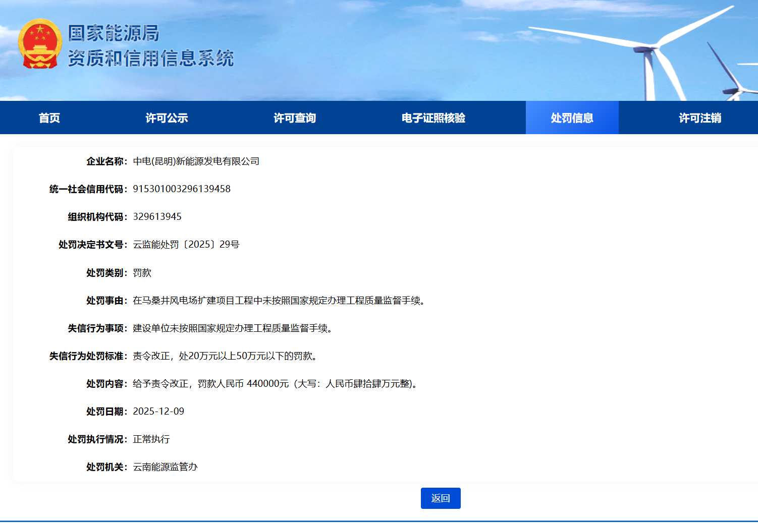 近日,国家能源局资质和信用信息系统信息显示,中电(昆明)新能源发电有限公司因在马桑井风电场扩建项目工程中未按照国家规定办理工程质量监督手续。云南能源监管办给予其责令改正,罚款人民币 440000元的处罚。