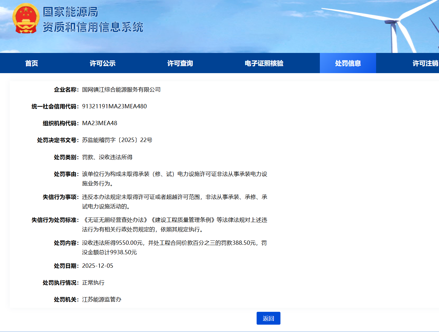 近日,国家能源局资质和信用信息系统信息显示,国网镇江综合能源服务有限公司因未取得承装(修、试)电力设施许可证非法从事承装电力设施业务行为。被江苏能源监管办给予其没收违法所得9550.00元,并处工程合同价款百分之三的罚款388.50元,罚没金额总计9938.50元的处罚。