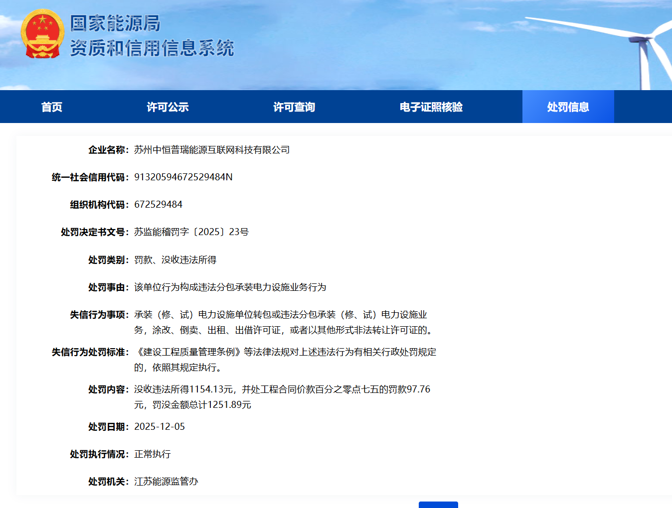 近日,国家能源局资质和信用信息系统信息显示,苏州中恒普瑞能源互联网科技有限公司因承装(修、试)电力设施单位转包或违法分包承装(修、试)电力设施业务,涂改、倒卖、出租、出借许可证,或者以其他形式非法转让许可证的。被江苏能源监管办给予其没收违法所得1154.13元,并处工程合同价款百分之零点七五的罚款97.76元,罚没金额总计1251.89元的处罚。