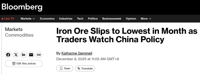 彭博社日前发文称,今年中国铁矿石进口强劲,主要中国港口的库存高于季节平均水平,但仍低于2024年水平。澳大利亚联邦银行的分析师Vivek Dhar表示:“考虑到中国的负钢厂毛利润、低迷的粗钢产量,铁矿石价格下跌的理由在加强。”