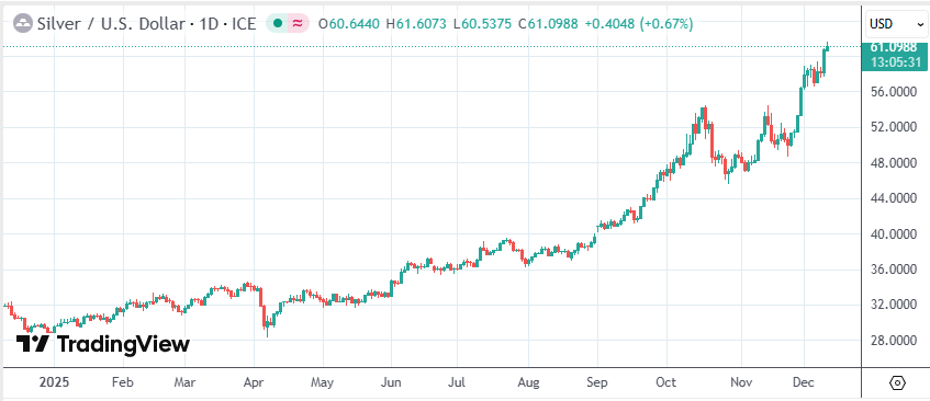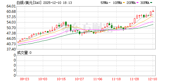 继隔夜历史性地升破每盎司60美元后,现货白银价格周三(12月10日)继续上涨。