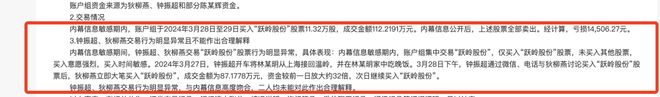 最终交易情况为,钟振超、狄柳燕控制的账户组于2024年3月28日至29日买入“跃岭股份”股票11.32万股,成交金额112.2191万元。内幕信息公开后,上述股票全部卖出。经计算,亏损14506.27元。