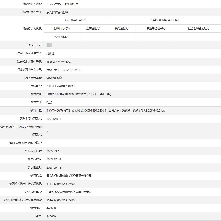 与此同时,潮新闻记者在国家税务总局广东省税务局的官网上,查到广东嘉星文化传媒有限公司的行政处罚信息。