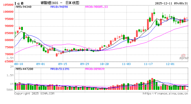 12月10日,碳酸锂期货震荡上行,主力合约LC2605报收于95980元/吨,上涨2.56%。
