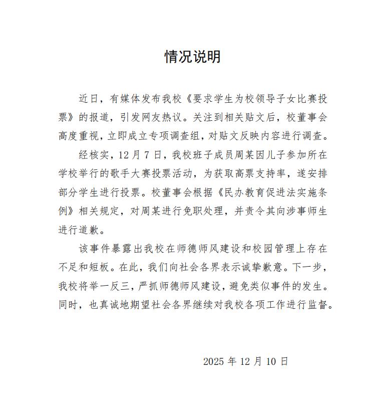 经核实,12月7日,我校班子成员周某因儿子参加所在学校举行的歌手大赛投票活动,为获取高票支持率,遂安排部分学生进行投票。校董事会根据《民办教育促进法实施条例》相关规定,对周某进行免职处理,并责令其向涉事师生进行道歉。