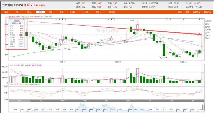 12月9日早盘的A股市场,五矿系两家上市公司的股价走势呈现戏剧性分化。五矿发展盘中震荡上行,上午10时后短短10分钟内,先遭遇2.29万手大单抛售,随即被2.28万手买单承接,股价迅速冲至10%涨停板。
