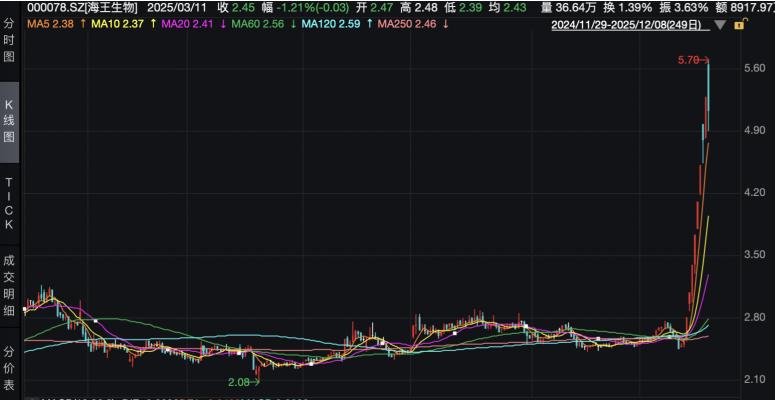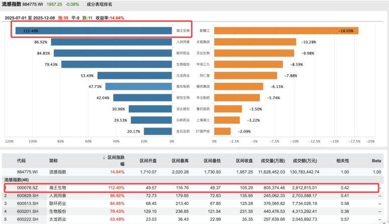 Wind数据显示,截至12月8日,下半年以来流感概念指数(884775.WI)累计上涨14.64%,在各类概念板块中位居前列,板块内35只个股实现上涨。其中,海王生物(000078.SZ)的表现尤为抢眼,在11月26日至12月5日的8个交易日内斩获7个涨停板,股价创下五年多来新高,同期累计涨幅超100%,也因此接连发布股票交易异常波动公告。公司在最新公告中提示,其市净率显著高于行业平均水平,存在市场情绪过热、非理性炒作风险,并明确提醒投资者注意股价快速下跌的可能。