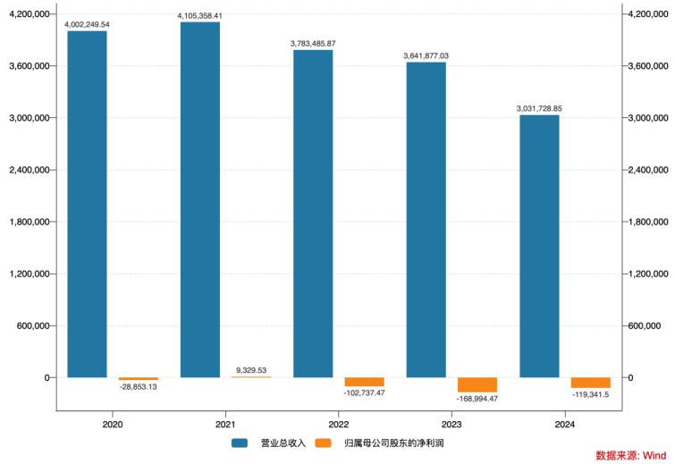 回溯历史业绩,海王生物的经营压力早已显现。2020年至2024年期间,除2021年外,公司营收持续下滑,净利润连续四年处于亏损状态,最近三年累计亏损金额约39亿元,分别为10.17亿元、16.9亿元和11.93亿元。