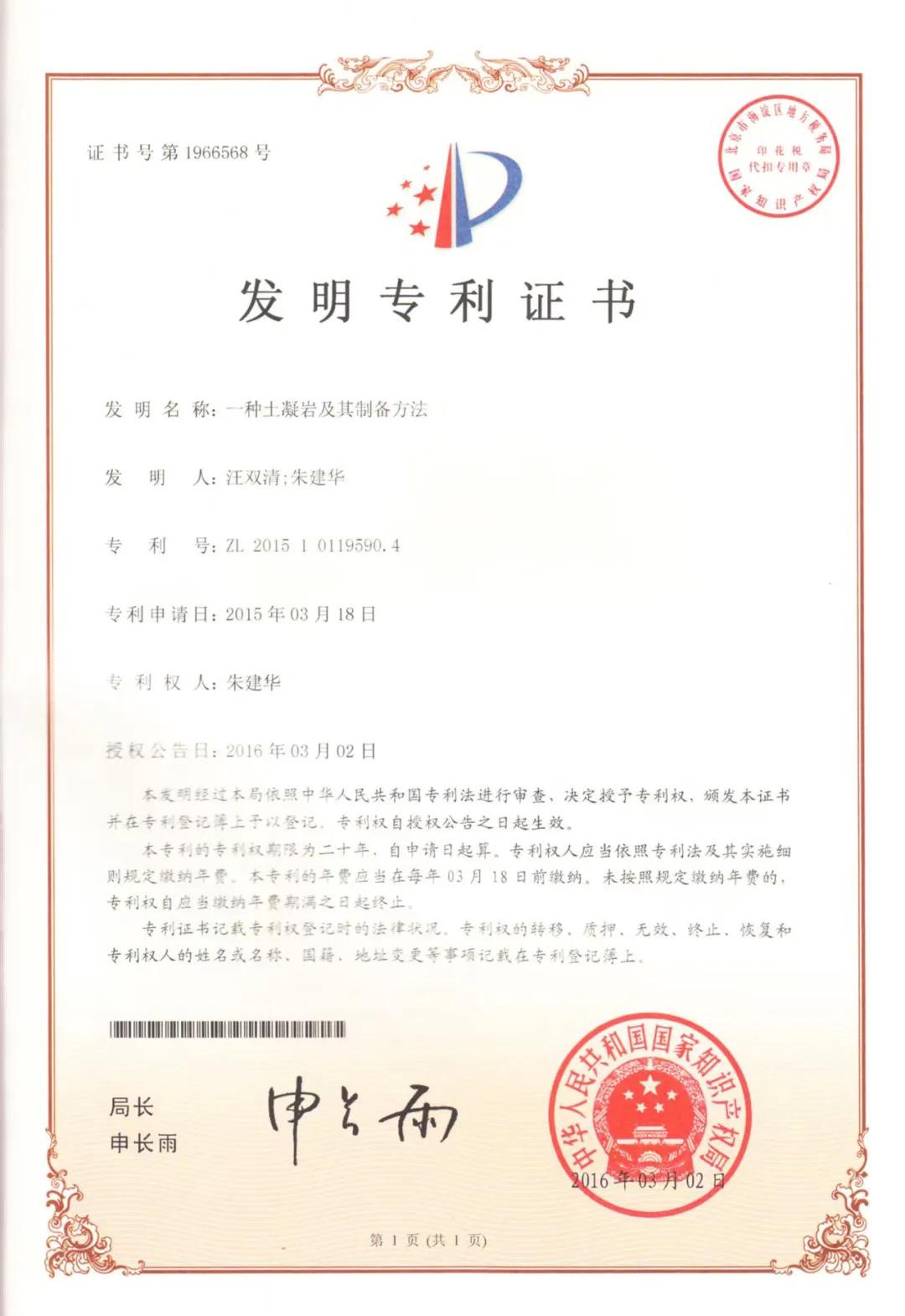 2015年,一项名为《一种土凝岩及其制备方法》的发明专利(专利号:ZL 2015 1 0119590.4)正式获得国家知识产权局授权,发明人为朱建华。此外,“土凝岩”这三个字,也是由朱建华“首创”的。