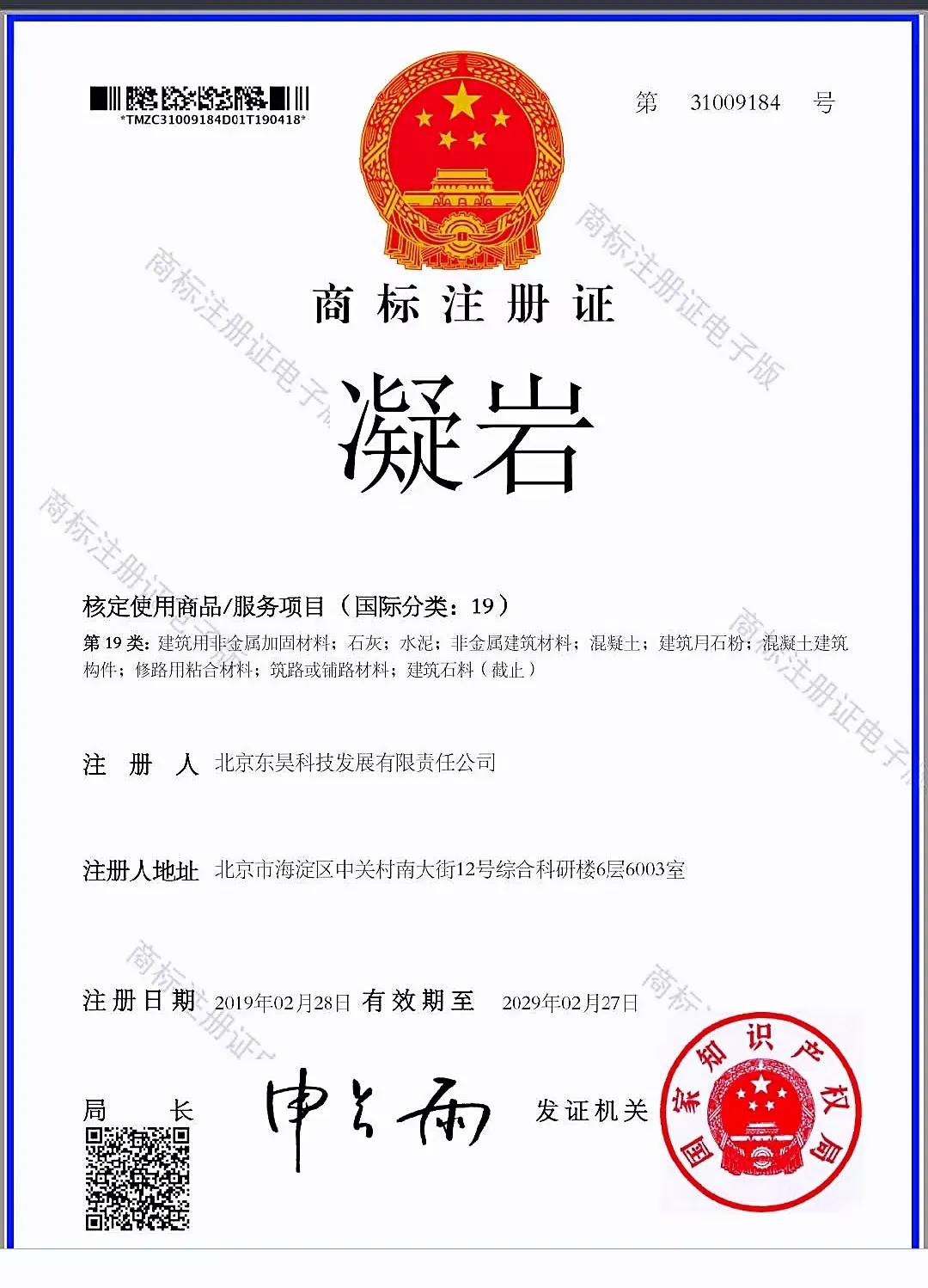 2019年,朱建华作为土凝岩(凝岩技术)发明人,向国家商标局进行申请,最终,“凝岩”商标被核定使用在建筑、建筑材料、筑路等领域。