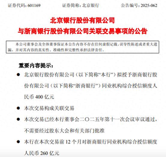 12月9日,北京银行(601169.SH)一则关联交易事项的公告引发市场侧目:其拟向同处万亿俱乐部的浙商银行(601916.SH)授予高达400亿元的同业综合授信额度,有效期两年。相较于上一周期(2024-2025年)260亿元的授信额度,此次授信规模大幅提升53.8%,增幅惊人。更关键的是,这笔看似常规的银行间合作,被明确标注为“重大关联交易”。