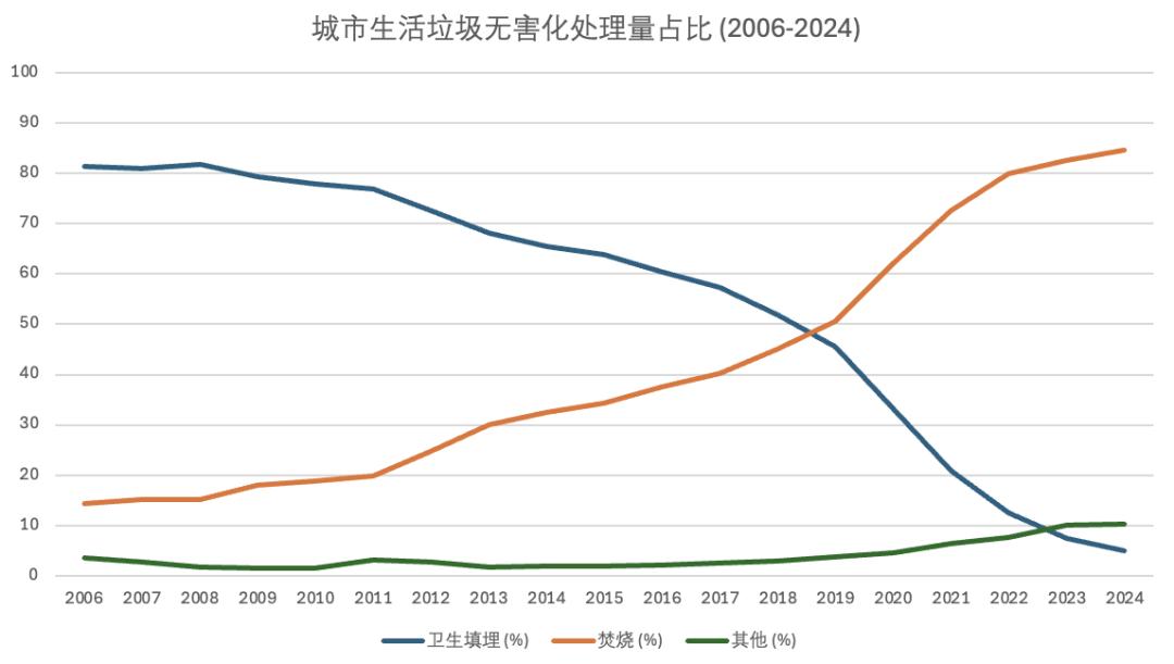 住建部数据显示,2024年,我国共有1482座城市无害化垃圾处理厂(场),其中313座为卫生填埋,占比21.1%,739座为焚烧,占比49.9%。截至2024年末,焚烧占我国城市生活垃圾无害化处理总量的比重为84.63%,已成为绝对主导;卫生填埋占比则如过山车一般,锐减至5.02%。