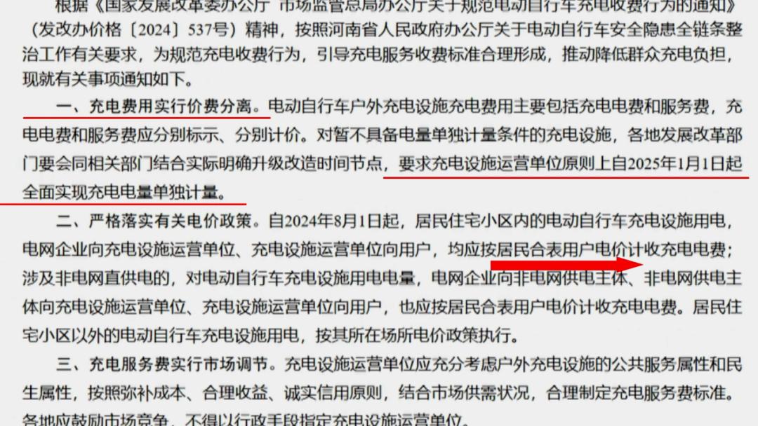 2024年,河南省发展和改革委员会、河南省市场监督管理局发布了《关于贯彻落实规范电动自行车充电收费行为有关事项的通知》,其中明确指出,充电费用实行价费分离;运营商应按照居民合表用户电价计收充电电费。