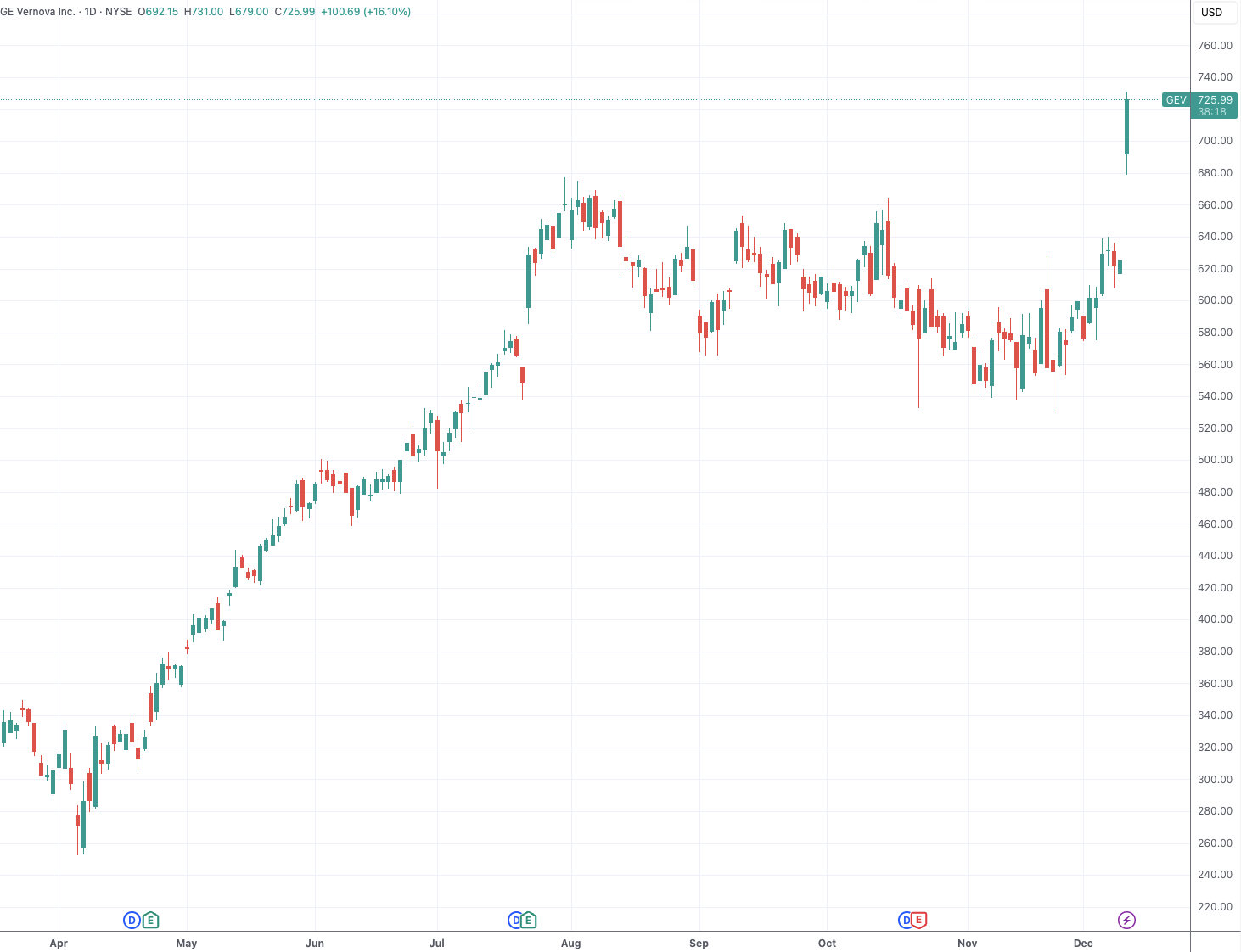 作为背景,GE Vernova与西门子能源、三菱重工并称全球燃气轮机市场的三大寡头。截至发稿,自2024年3月从通用电气分拆独立后,GE Vernova股价已经翻了6倍,其中年内迄今为止翻了一倍有余。