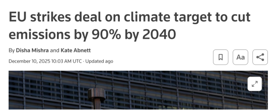 据路透社等外媒报道,欧盟各国与欧盟议会近日达成协议,计划到2040年将温室气体排放量减少90%,这一目标推迟了关于气候评估的争议,并将排放交易体系应用推迟至公路运输和建筑行业一年。目前欧盟2030年减排55%的目标已接近实现,但2040年碳中和目标的正式生效日期未定。