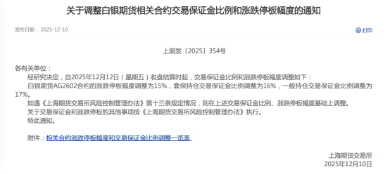 12月10日晚,上海期货交易所(下称“上期所”)发布通知,调整白银期货相关合约的交易保证金比例及涨跌停板幅度,以应对近期市场波动并强化风险防控。
