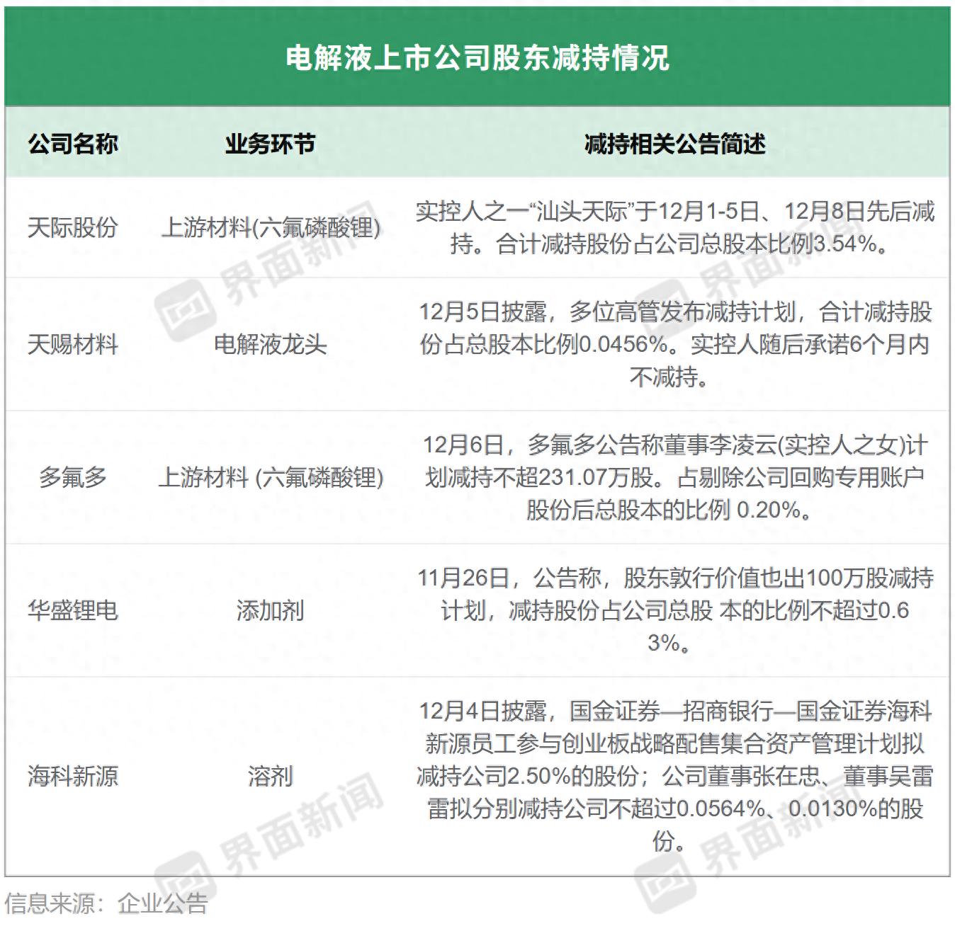 据界面新闻记者不完全统计,11月底以来,已有包括华盛锂电(688353.SH)、天际股份(002759.SZ)、海科新能(301292.SZ)、天赐材料(002709.SZ)和多氟多(002407.SZ)在内的多家电解液行业上市公司的股东、高管等计划减持。