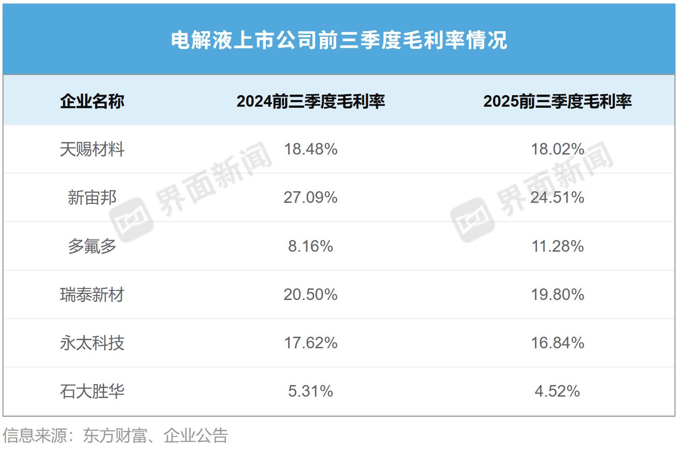 据界面新闻观察,今年前三季度,锂电电解液上市公司的毛利率总体有所下滑。其中,天赐材料毛利率同比下滑0.46个百分点,新宙邦毛利率同比下滑2.58个百分点。