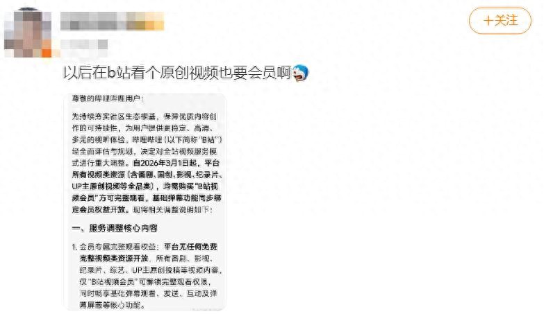 近日,一张关于B站(哔哩哔哩)“所有视频类资源均需购买B站视频会员方可完整观看,基础弹幕功能同步绑定会员权益开放”的相关截图在社交平台流传。