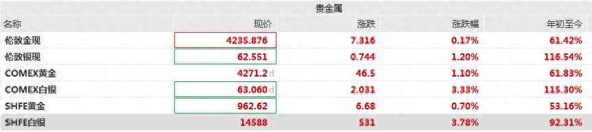 COMEX白银向上突破63美元/盎司,现报63.060美元/盎司,同样续创新高,年内涨幅115.30%。