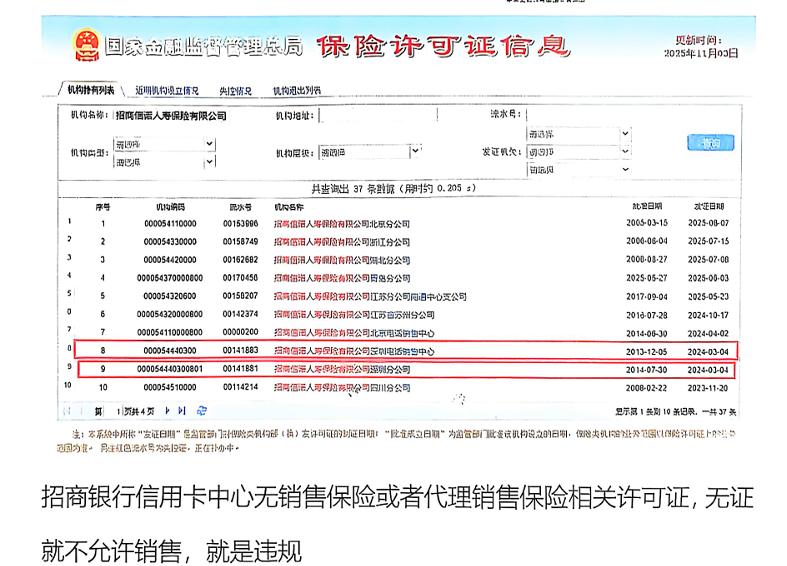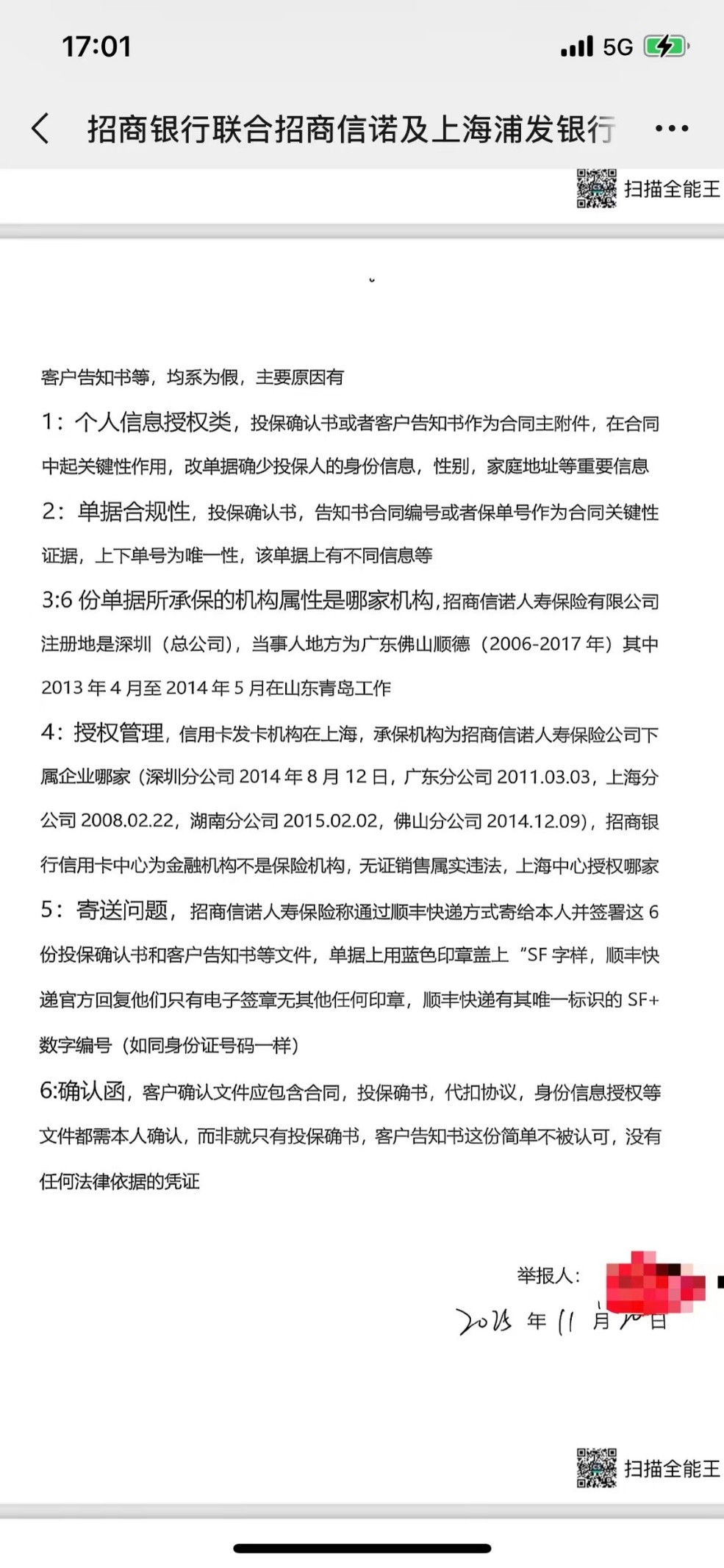 “我从未在招商信诺购买任何保险,且该公司无法提供有效的保险合同、签字保单、银行代扣协议及身份信息授权等关键文件。尽管招商信诺事后提供了“投保确认书”和“客户告知书”,但这些文件存在信息不全、编号不一致、承保机构不明、寄送凭证造假(如使用非顺丰官方印章)等问题,涉嫌伪造。此外,招商银行信用卡中心在未取得保险代理许可证的情况下就已经开始销售保险,且他们在我信用卡扣费的日期皆晚于他们的发证日期,属于违规行为。”