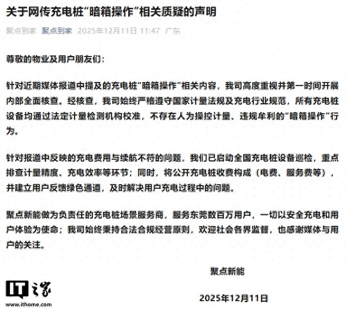 针对报道中反映的充电费用与续航不符的问题,聚点新能已启动全国充电桩设备巡检,重点排查计量精度、充电效率等环节;同时,将公开充电桩收费构成(电费、服务费等),并建立用户反馈绿色通道,及时解决用户充电过程中的问题。