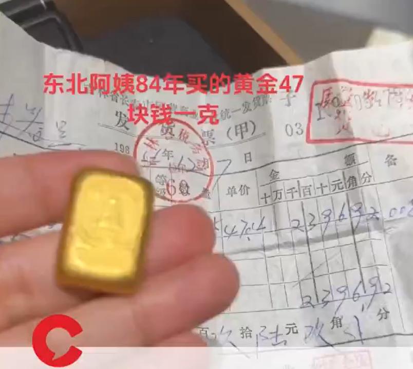 近日,广东一珠宝店店员发视频称一位东北阿姨1984年买的黄金,当时仅47元/克,阿姨买了50克,花了两千多块钱。