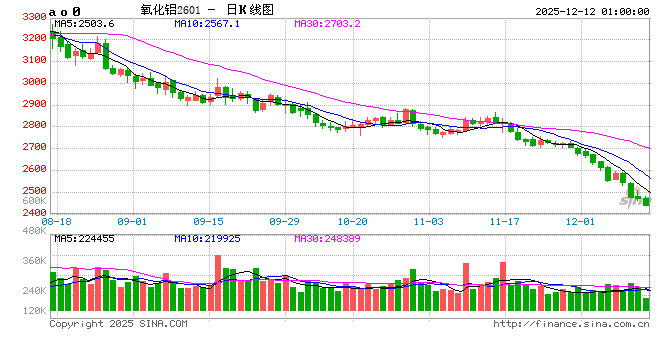 12月11日,国内期货市场氧化铝期货主力合约2601价格最低已探底至2462元/吨,而此前在2024年12月5日,该主力合约报价为5540元/吨。